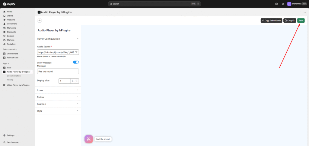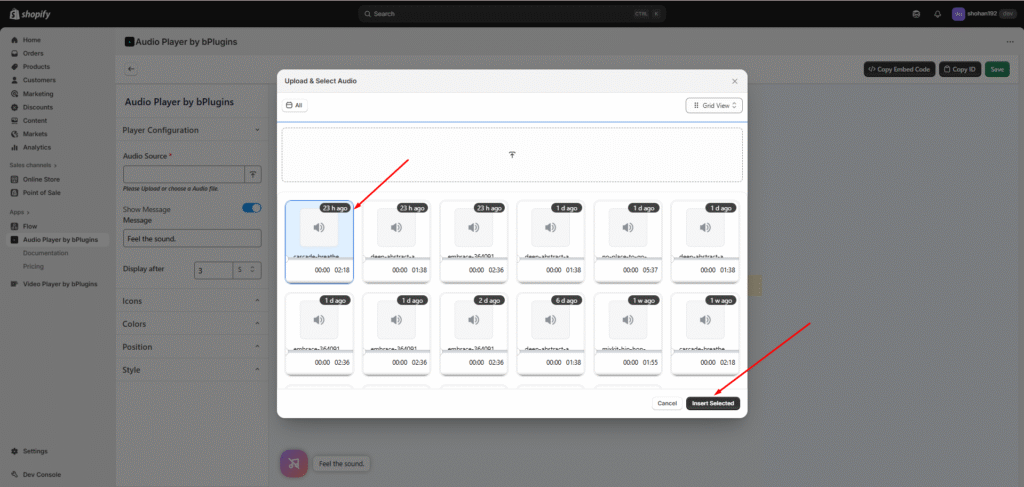 The “Audio Source” input field lets you paste an existing audio URL or click the Upload button to open a modal. In the modal, you’ll see all the audio files available in your store — you can select one from there or upload a new audio file and select it. After Upload You need to save it.
