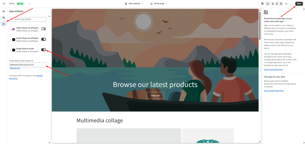 Then, open the App Embeds section and select “Single Button Audio” under the Audio Player by bPlugins app.