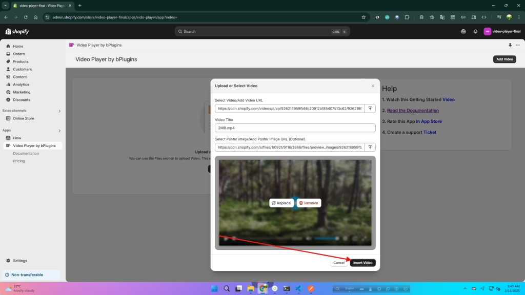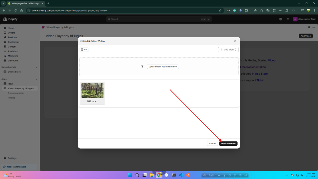 4. After uploading the video, click “Insert selected” to proceed to the next step.