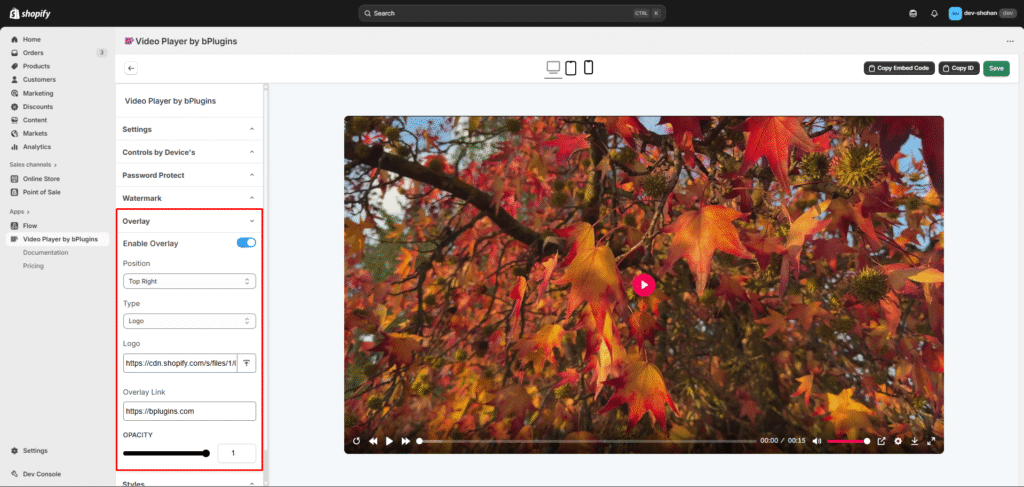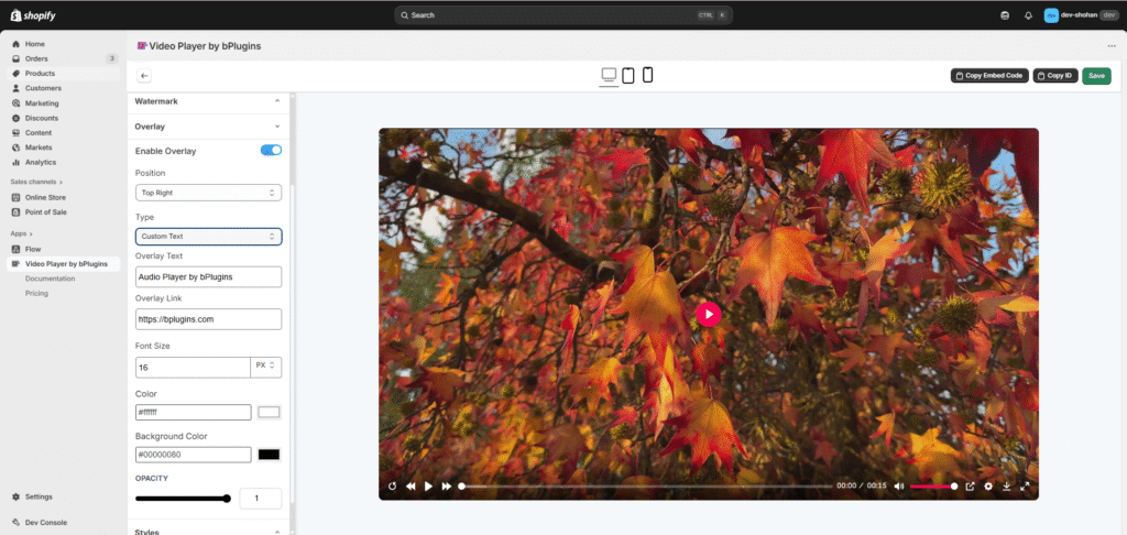 Select either an Logo or Custom Text to display on the video.